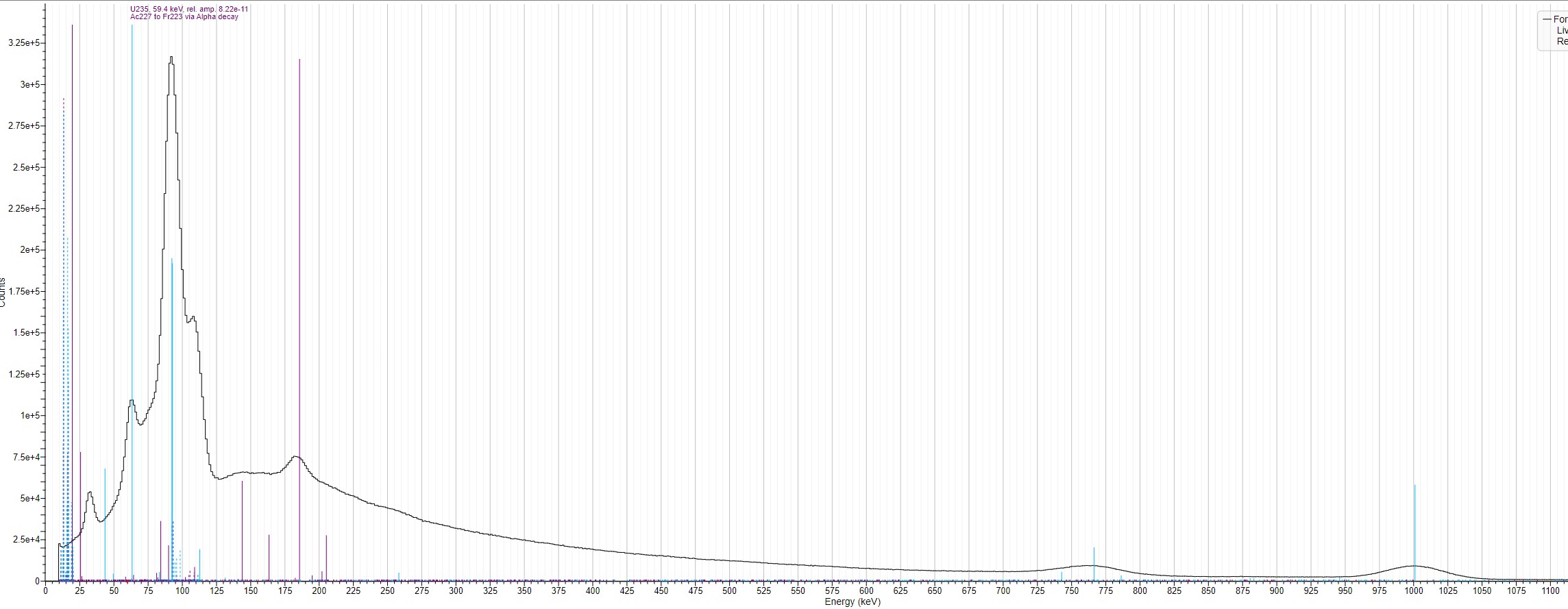 A = here I have a doubt as the peak falls halfway between two possible main emissions, one of U238 and one of U235 as can be seen from the Interspec low energy image. Both are "probable", the first, for U238, Pa234m>U234 at 43.5 KeV while the second, for U235, Th231>Pa231 at 25.65KeV. It is obvious that here I should have better calibrated the probe using maybe the 32kev line of the Cs137 and perhaps the peak would have fallen more precisely. But anyhow… What do you think?? The peak is at 32.33 KeV but probably miscalibrated