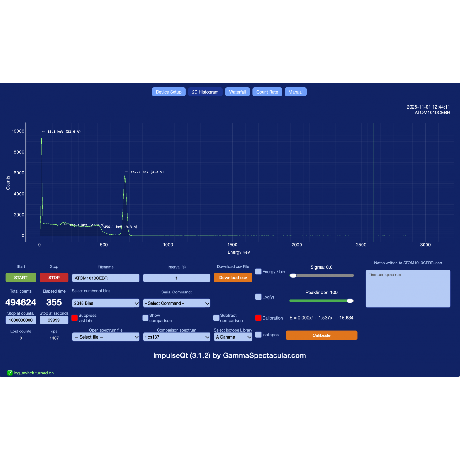 ATOM-1010-CEBR offers true plug and play spectrometry, with incredible resolution. The Software which is open source provides a powerful interface with powerful features like background subtraction and isotope libraries to help you identify peaks.