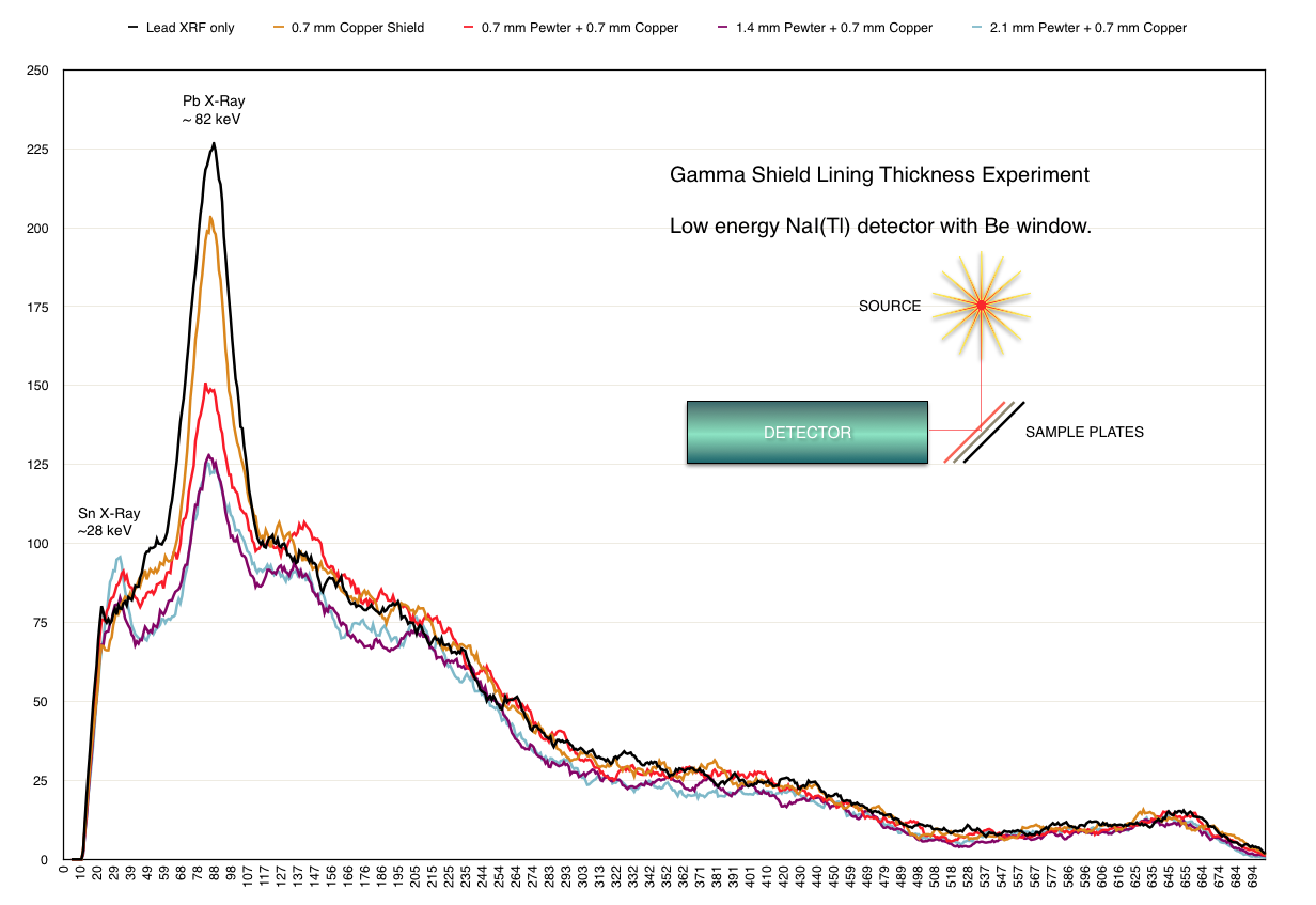 I often get asked about copper lining of lead shields and how thick to make the lining, so with a bit of time on my hands today I ran a couple of experiments to determine the effect of copper and tin on the unwanted Pb x-rays that show up in our spectra.