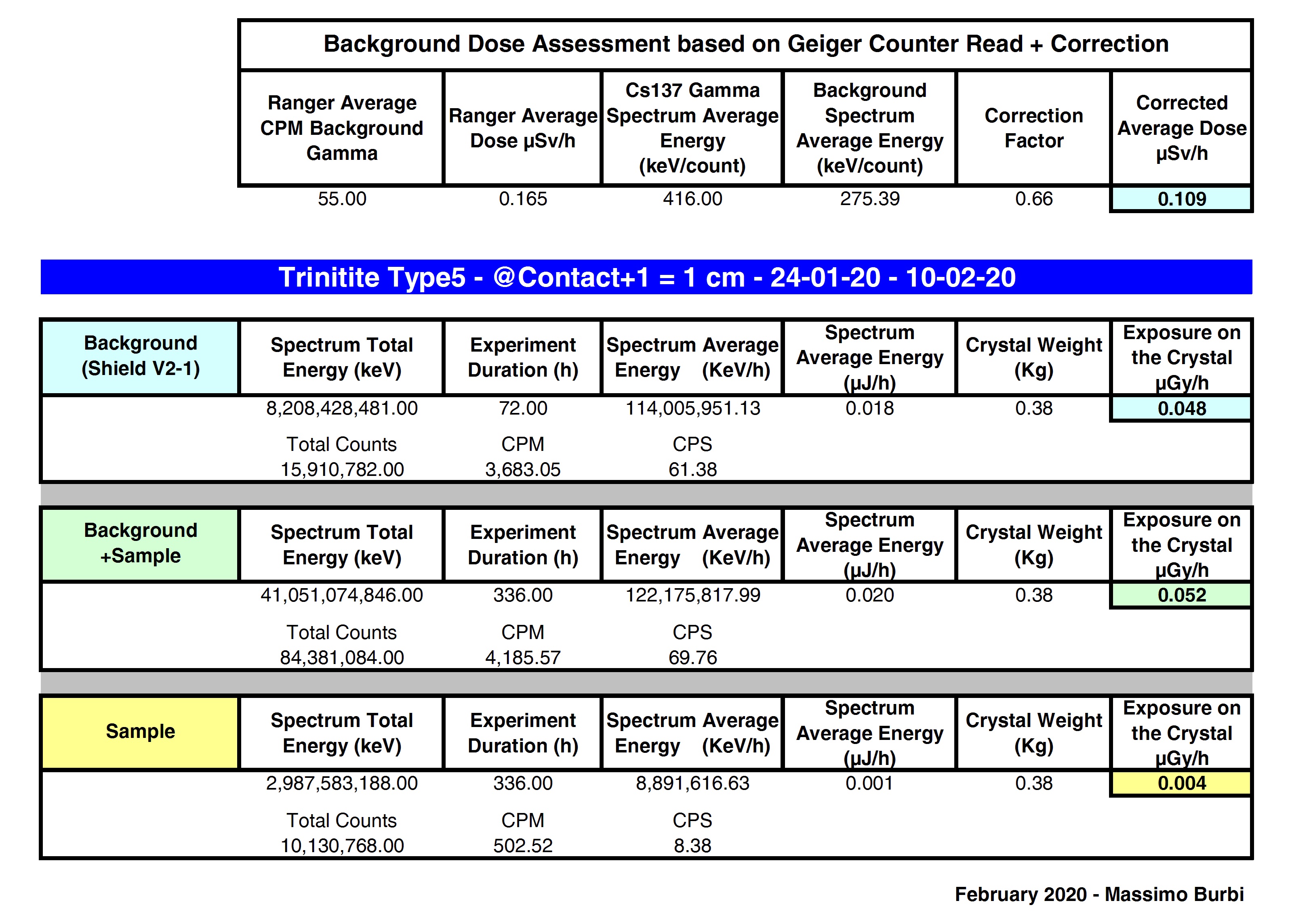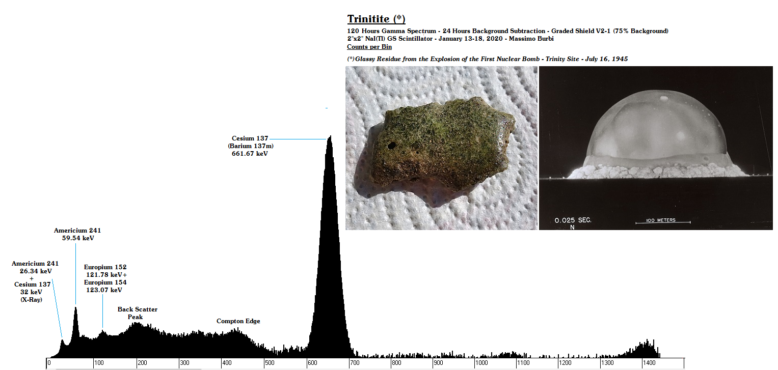 They have a number of Trinitite samples for sale and other very interesting radioactive minerals. As for the Trinitite they have “ordinary” specimens, but what caught my attention was what they call “Type 5” ones, which are from a single collector and apparently come from pretty close to the blast, where the neutron flux was more intense. Activation by neutron capture was the process from which Eu152 (and Eu154) originated, therefore Europium abundance in the Type 5 samples is supposed to be higher than in “ordinary” samples.