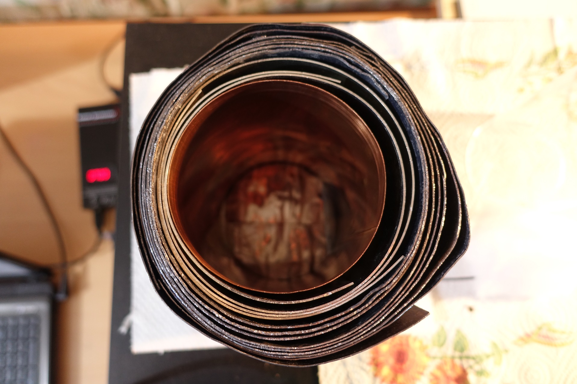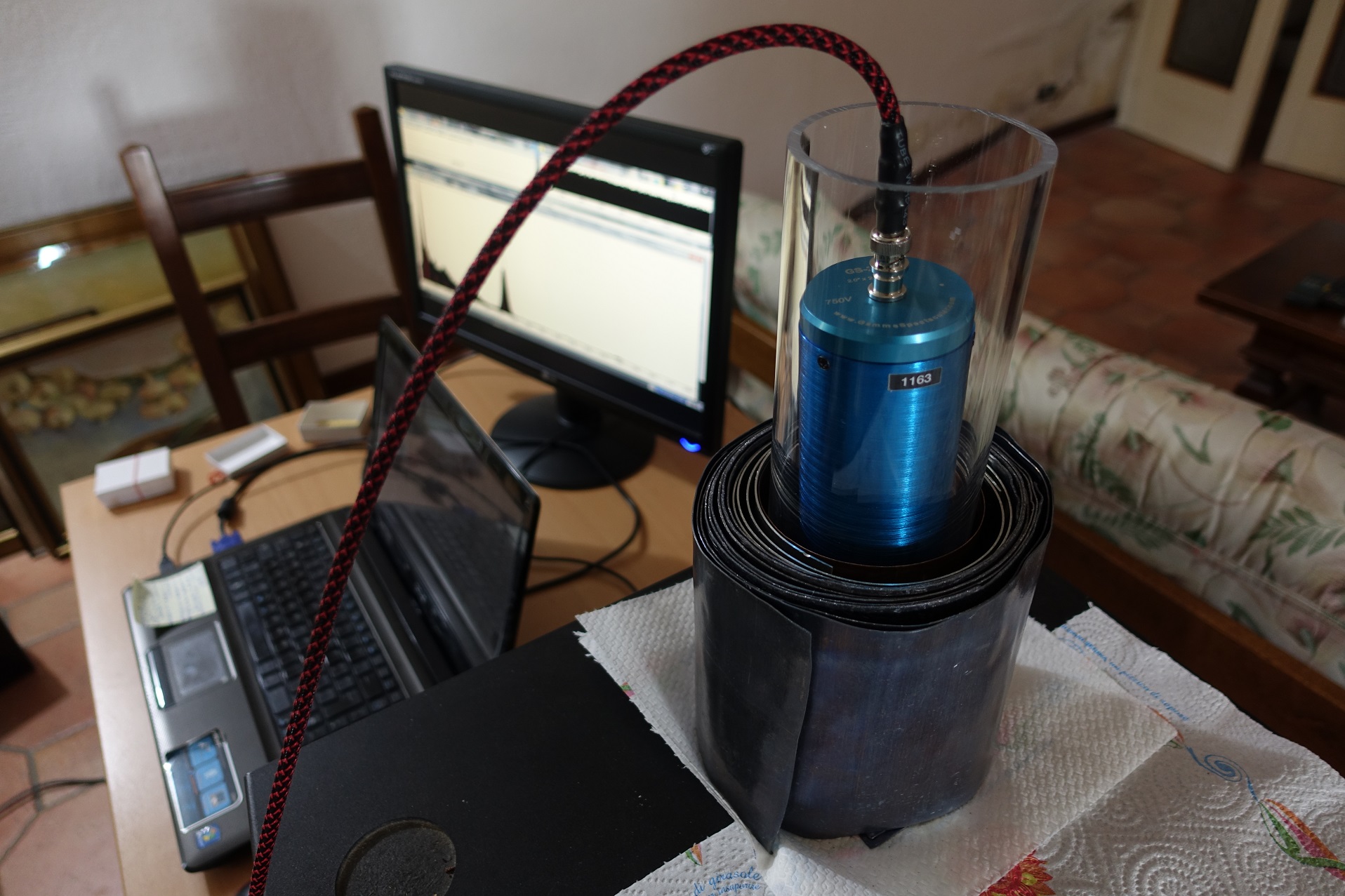 And then it was time to get to serious business. As usual I first recorded a 24 hours background. My shielding was basically the same as I my last experiments, 5 mm of plastic, 1 mm of copper, 4 mm of pewter and 13-15 mm of lead. I took advantage of the lead foils used by Mineresco to wrap the Trinitite samples to improve the shield’s weakest part, which is the “wall” at the end of the room. It’s still pretty thin (just 1-2 mm) but at least it now covers the whole cross section.