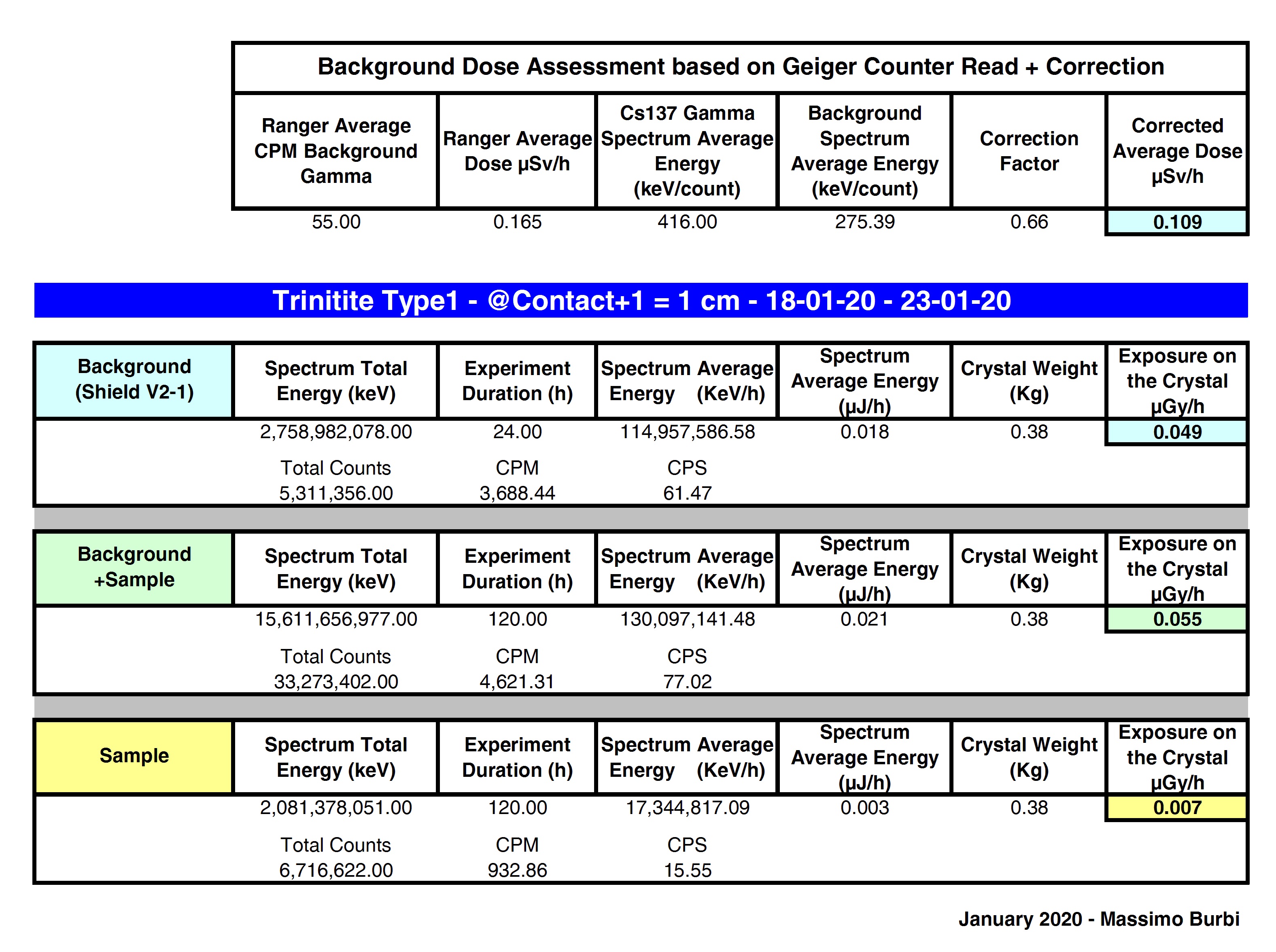 Interestingly, adding more background erased what looked like a weak Eu152 peak at 1408 keV turning it into an even weaker K40 peak. That wasn’t expected, but already in the past testing other Trinitite samples I had that peak coming and going and it wasn’t never really clear to me if it was a genuine Eu152 or not. I think I can now say it probably wasn’t.